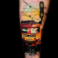 Tatuaggio del braccio molto dettagliato in stile 3D di un treno molto preciso