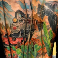 Tatuaggio molto realistico dipinto a maniche colorate di un treno enorme