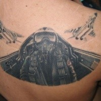 Tatuaggio scapolare colorato in stile lavato grigio degli aerei da combattimento con pilota