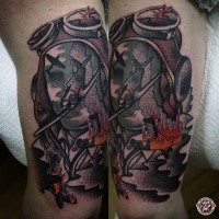Tatuaggio di gamba colorata stile vecchia scuola del teschio di Pilon ribelle con elmo