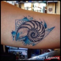 Tatuaggio con avambraccio nautilo colorato in stile geometrico semplice